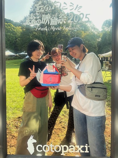 お隣のcotopaxiさんブースでパシャ📸 (左から)サトウ・カワツ・オノマエが今回の映画祭ブースを担当しました!