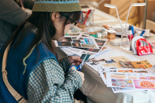 私たちが用意した沢山のコラージュ作品の中から素材を選んで、ひたすらチョキチョキ、ひたすらペタペタ。