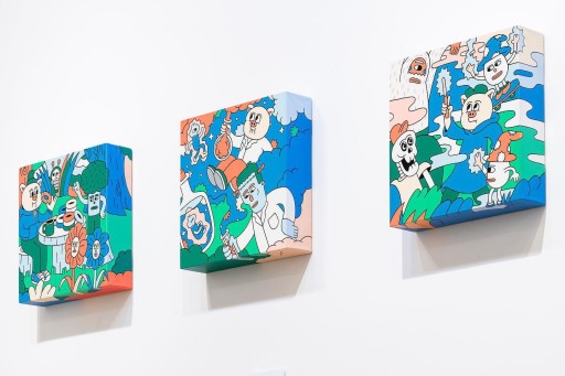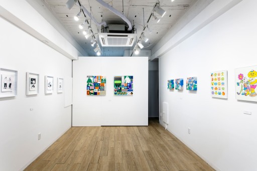 全然個展とかやったことなかったんで、何もかもわからなかったですね。主人公キャラもいなかったし、他の人の個展を参考にしました。例えばKAWSの個展とか見て、「こういう風に連作で並べるのかな」とか考えて。白黒の絵をまとめて壁に並べたり、一個ポンって置くより、塊として見せる感じで組み立てました。