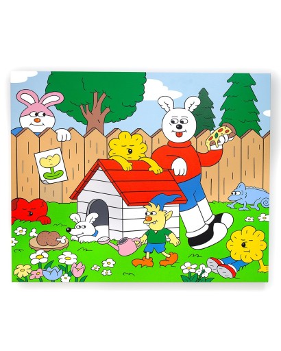 この作品のきっかけは、愛犬の存在でした。「ぽかぽか平和で愛犬と自分が遊んだり、お昼寝できるような場所」が頭に浮かび、庭をモチーフにしました。