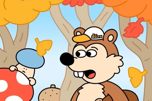 リスは冬支度でどんぐりを集めています。でも大きいどんぐりから先に取られるので、小さいどんぐりはしれっとしているんです。奥には大きなどんぐりが木の影に不安そうに隠れています。先頭にはキノコの友達がいて、どんぐり集めを手伝ってくれます。