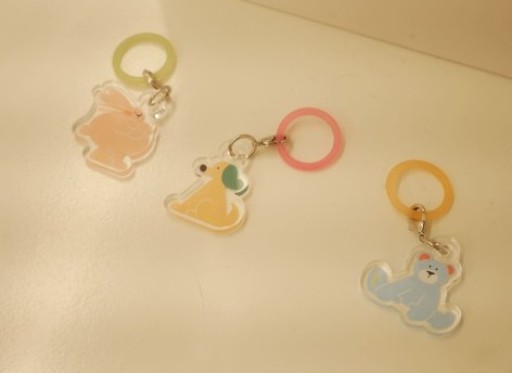 今回、初めてアクリルキーホルダーを作りました!流行りもあって、ずっとやってみたかったんです。犬やくま、うさぎを描いてほしいというリクエストに応える形でラインナップしました。最初は大きいサイズを考えてたんですけど、ママ友から「小さい方が可愛いよ!」と言われて小さくしたんです(笑)。そのおかげで、ポーチやカバンにつけやすく、日常にさりげなく馴染む感じが気に入っています。