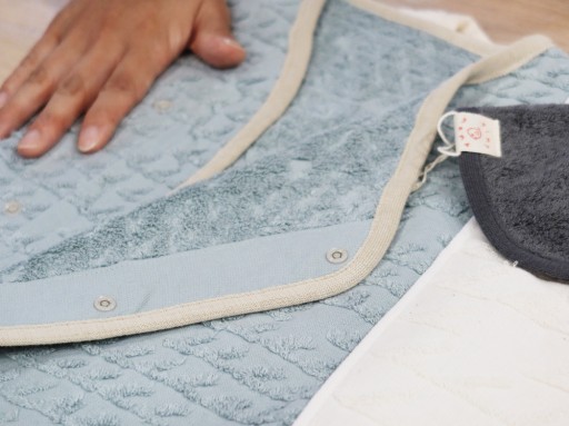 吸水性が良いので汗やよだれをしっかり吸ってくれますし(今治タオルは「水に1cm角のタオル生地を浮かべて、5秒以内に沈み始めることができたら合格」という吸水基準があります)、あとはホルムアルデヒド検査もしています。そのあたりも安心できるかなと思います。