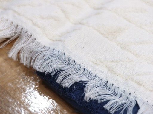 タオルのフリンジの部分には、普通のフリンジではあまりやらないという「千鳥」の縫製が。これによって、赤ちゃんが口に入れたり引っ張ったりしても糸がほどけにくいそう。