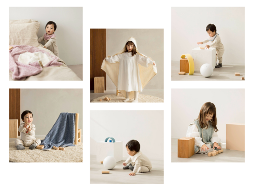 特に、生地の柔らかさをダイレクトに感じることができる無地の『feel』シリーズは、よりモダンな雰囲気にしているので、親御さんのお洋服とも馴染みやすいと思います。