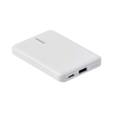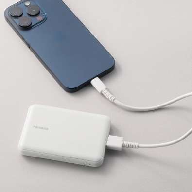 《ツインバード》のモバイルバッテリーは、5,000mAhの電池容量で、一般的なスマートフォンなら1回のフル充電が可能(機種による)。