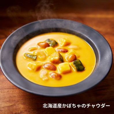 コーンポタージュ、ふかうら雪人参ポタージュ、北海道産かぼちゃのチャウダー、北海道産スイートコーンのチャウダーの4種をお届け。